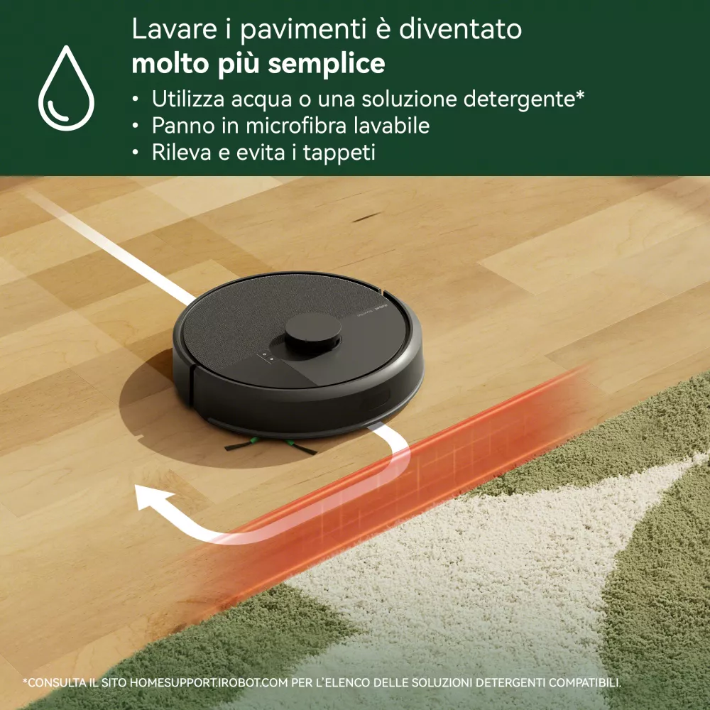 Basta seguire 3 semplici passaggi per passare il mocio: riempi il serbatoio del robot con acqua o soluzione detergente, reinserisci il serbatoio nel robot e aggiungi il panno per il lavaggio. I panni in microfibra possono essere utilizzati fino a 30 volte e Roomba® rileva ed evita i tappeti.