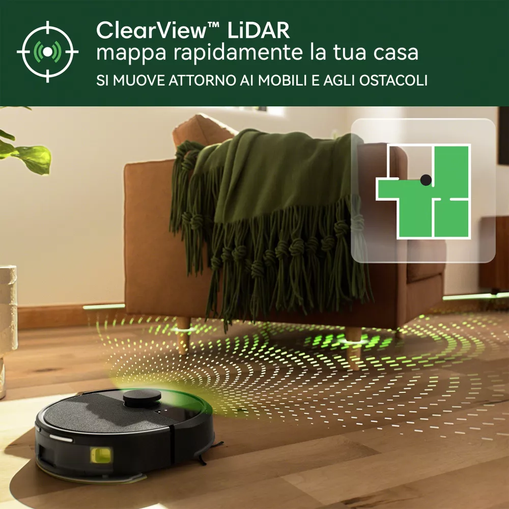 ClearView™ LiDAR mappa rapidamente la tua casa in pochi minuti, evita gli ostacoli e pulisce in file ordinate, anche al buio.