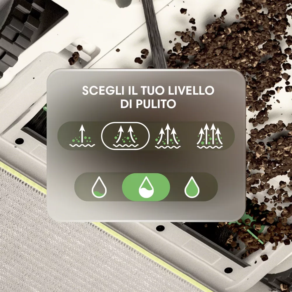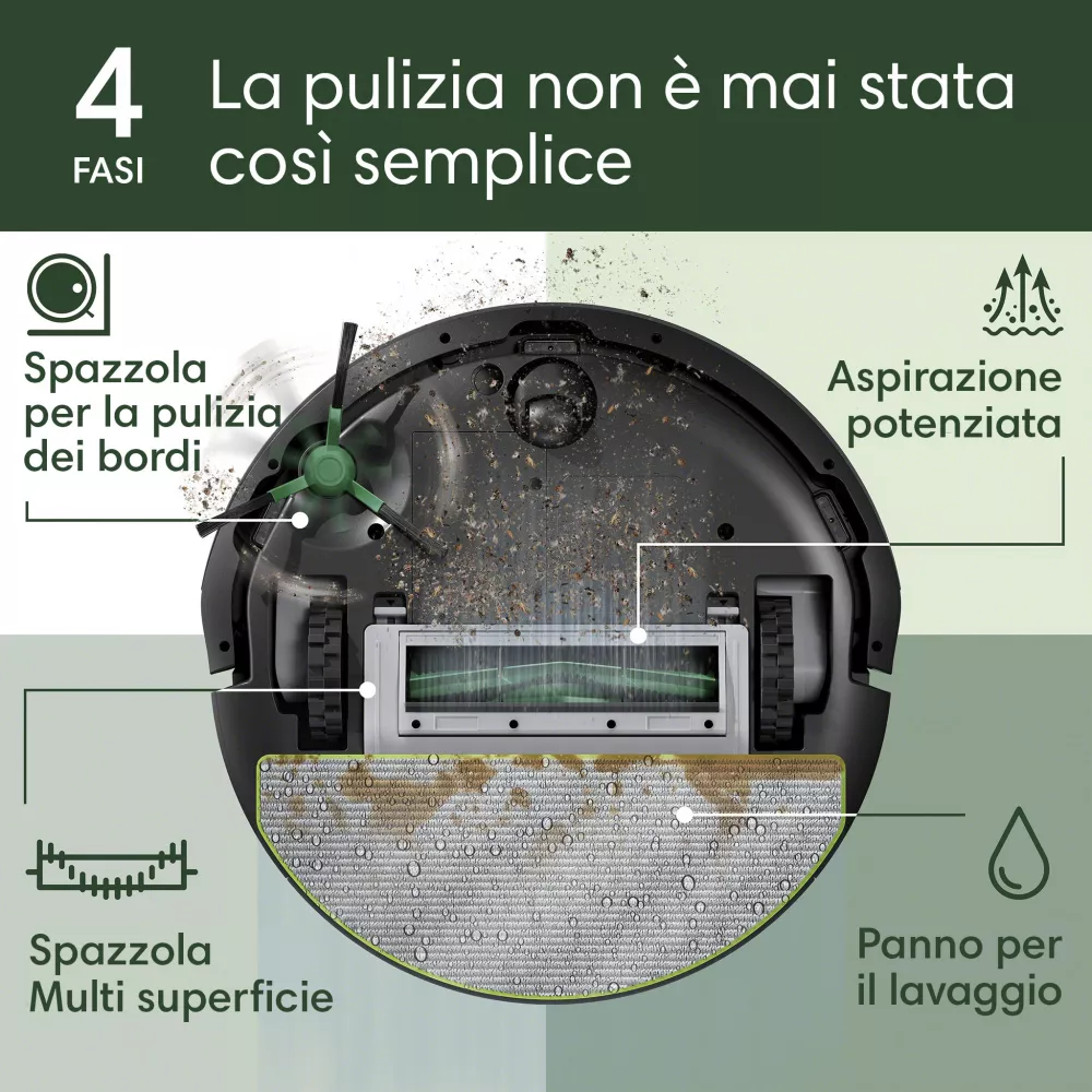 Il sistema di pulizia a 4 fasi prevede una potenza di aspirazione pari a 7000 Pa, una spazzola a setole multi-superficie e una spazzola per i bordi per eliminare sporco e polvere, oltre a un panno in microfibra per lasciare i pavimenti lucidi e puliti.