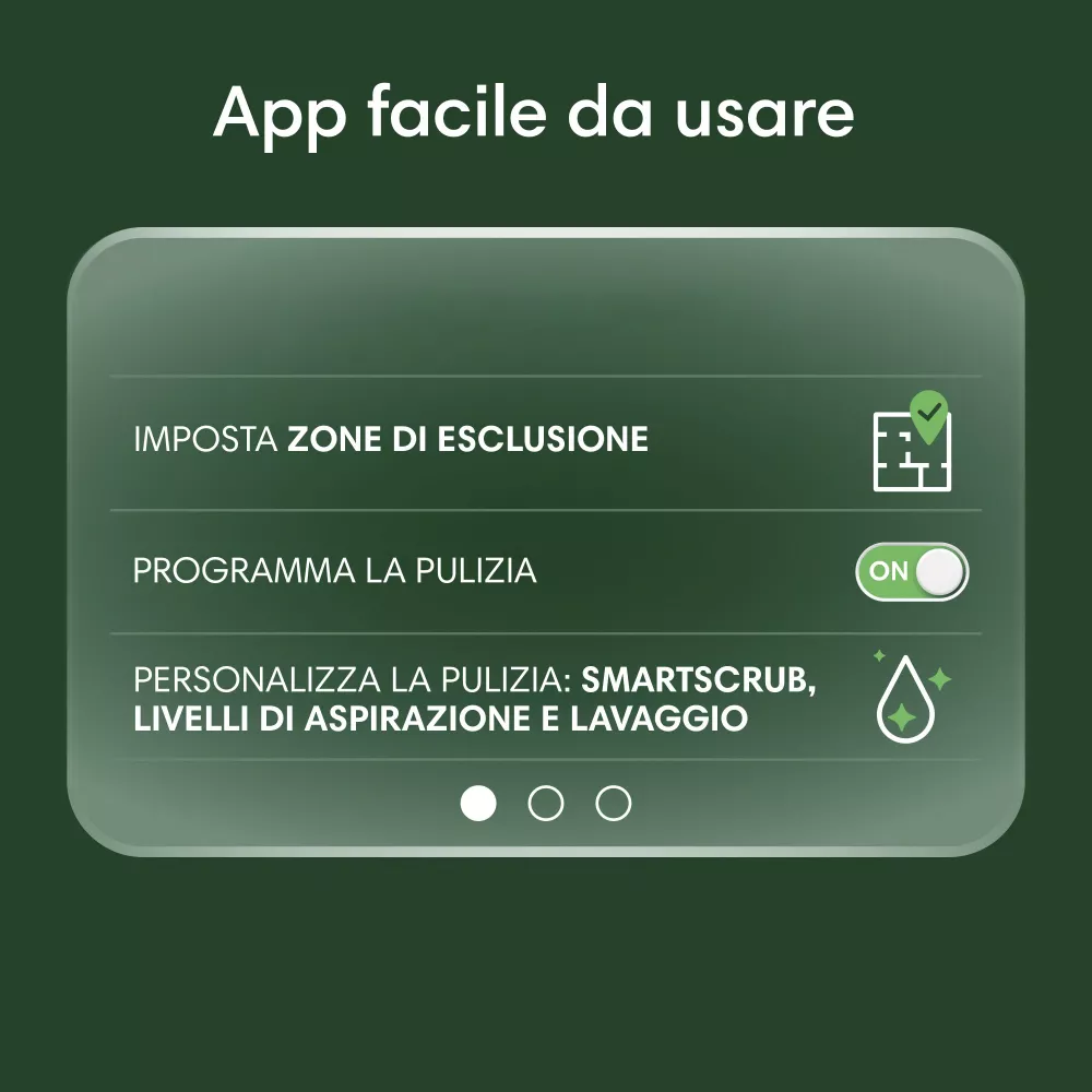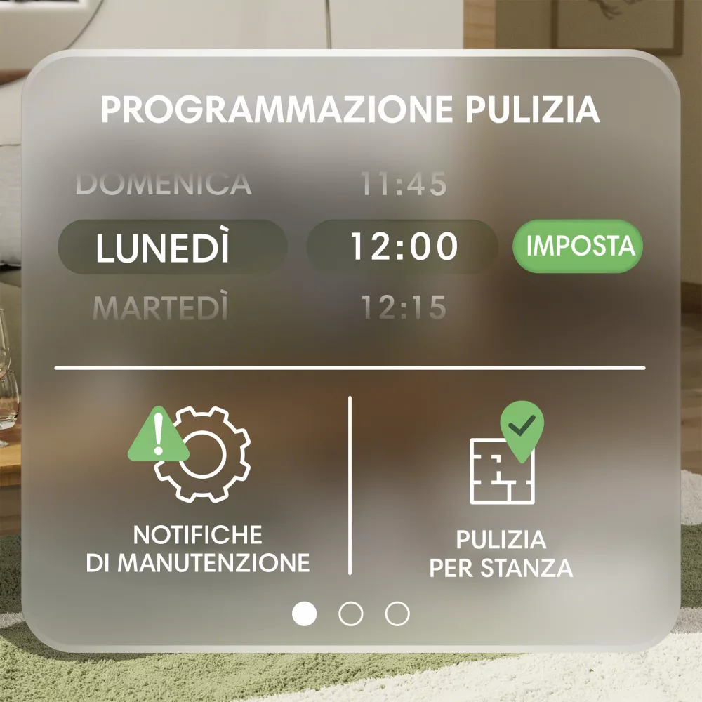 Pianifica e seleziona le stanze in base alla tua routine quotidiana e regola il numero di passaggi di pulizia, i livelli di potenza di aspirazione e la quantità di acqua rilasciata sul panno in microfibra.