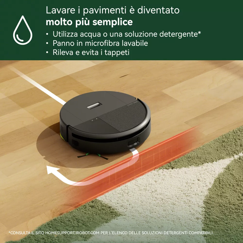 Basta seguire 3 semplici passaggi per passare il mocio: riempi il serbatoio del robot con acqua o soluzione detergente, reinserisci il serbatoio nel robot e aggiungi il panno per il lavaggio. I panni in microfibra possono essere utilizzati fino a 30 volte e Roomba® rileva ed evita i tappeti.