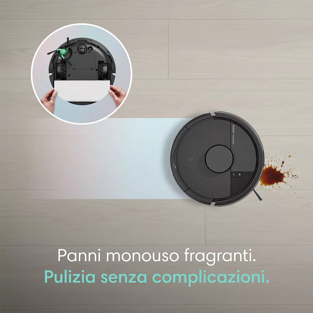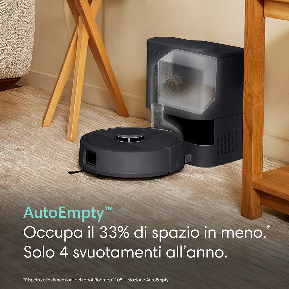 Progettato per una pulizia efficace anche negli spazi più stretti, il robot aspirapolvere e lavapavimenti  Roomba® Mini con base AutoEmpty™ combina un design compatto, aspirazione potente e lavaggio pratico in un’unica soluzione. Dotato di navigazione ClearView™ LiDAR e di una base autosvuotante con sacchetto AllergenLock™, offre fino a 90 giorni di pulizia a mani libere, raggiungendo facilmente anche le aree sotto i mobili.