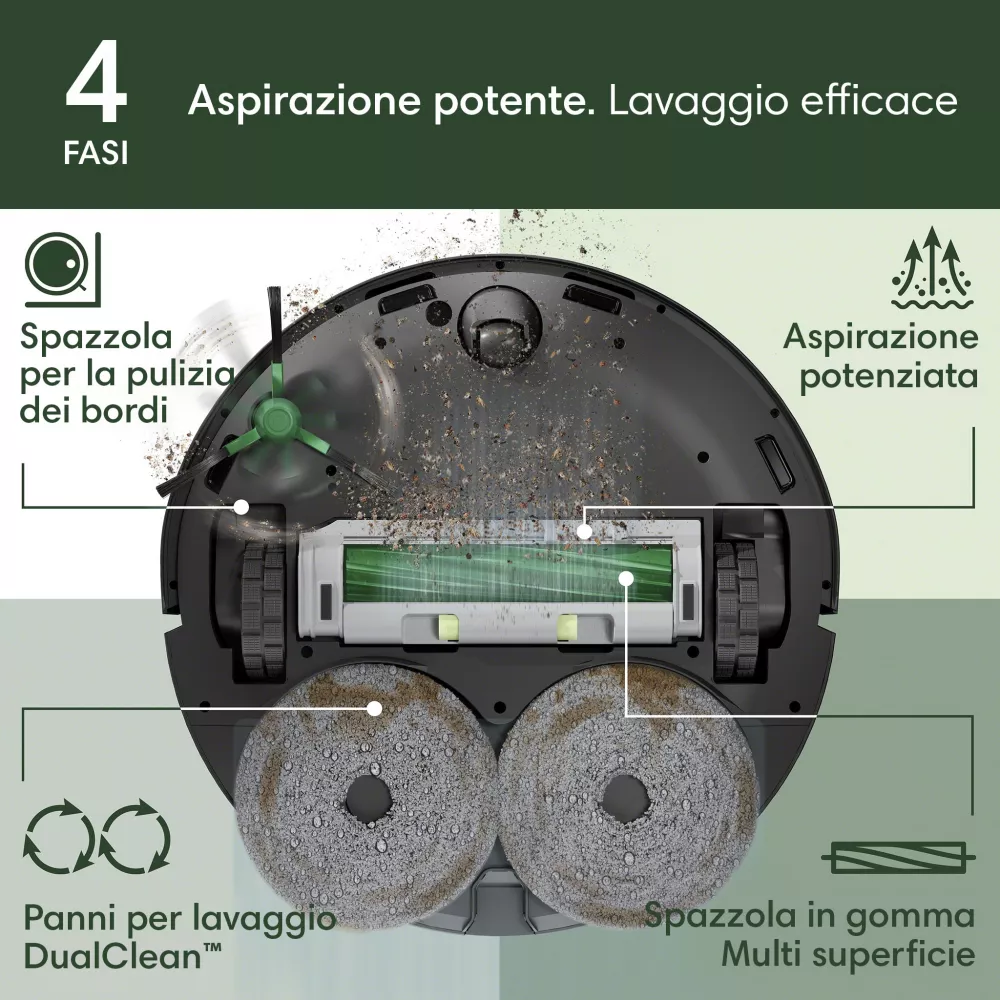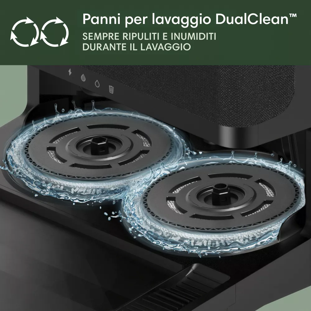 I panni Spinning DualClean™ e la funzione SmartScrub eliminano le macchie con una pulizia 2 volte più profonda e una pressione costante verso il basso. Per la pulizia puoi utilizzare la soluzione detergente iRobot o dell'acqua.