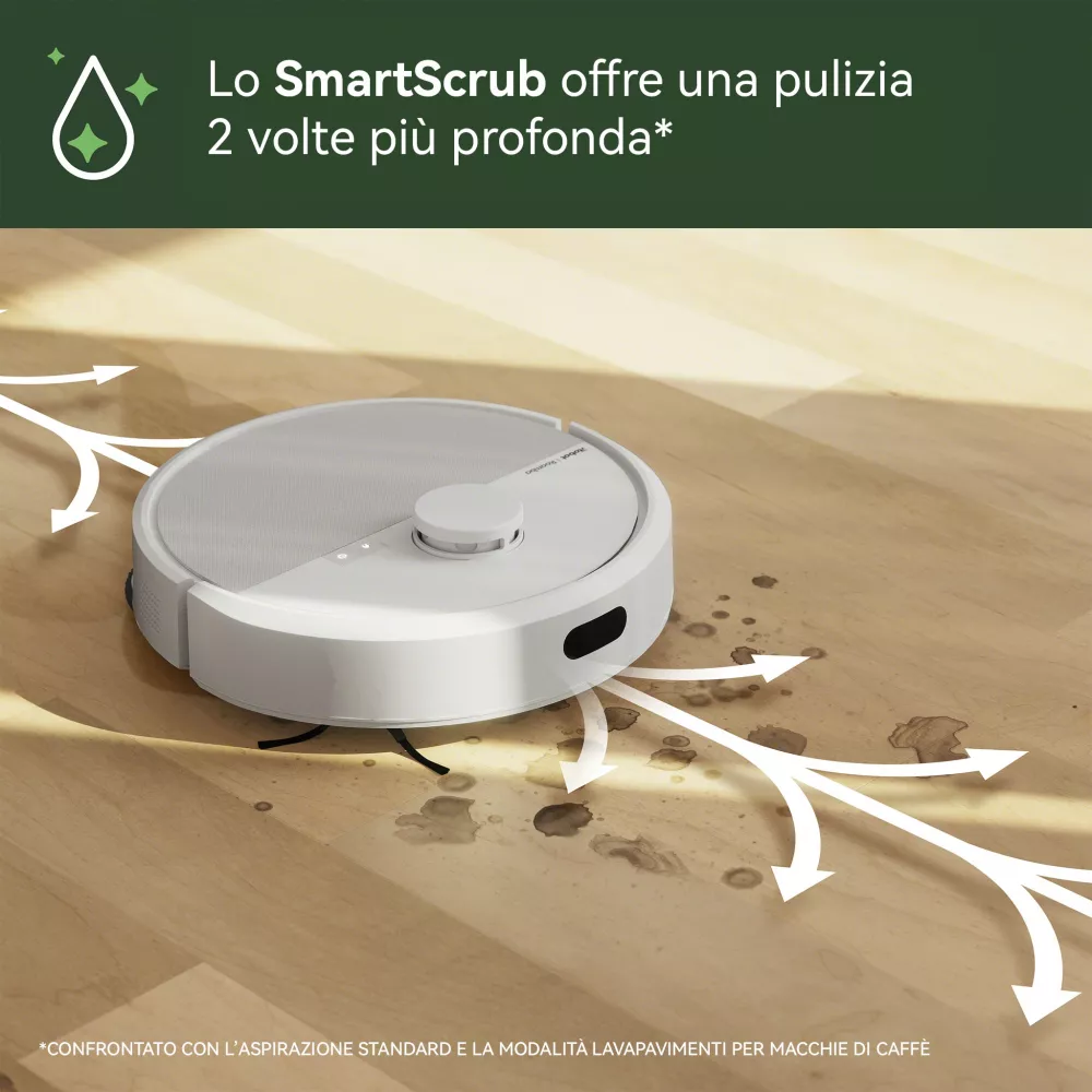 Sì, e la scelta è tua! Il tuo robot ha 4 modalità di pulizia: solo aspirazione, solo lavaggio, entrambe contemporaneamente, oppure aspirare prima e poi lavare. Inoltre, evita automaticamente i tappeti nelle modalità di pulizia aspirazione + lavaggio o solo lavaggio, quindi non c'è bisogno di preoccuparsi di ulteriori disordini.