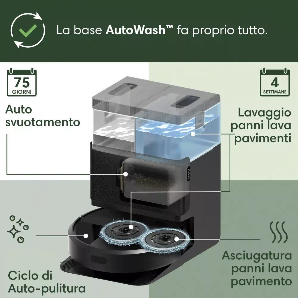 Il tuo robot tornerà alla sua base per svuotare automaticamente i detriti, lavare automaticamente i panni quando necessario durante la pulizia, e poi li lava e li asciuga quando la pulizia è completata. Un ciclo di auto-pulizia pompa acqua attraverso la base, lavando via eventuali detriti accumulati.