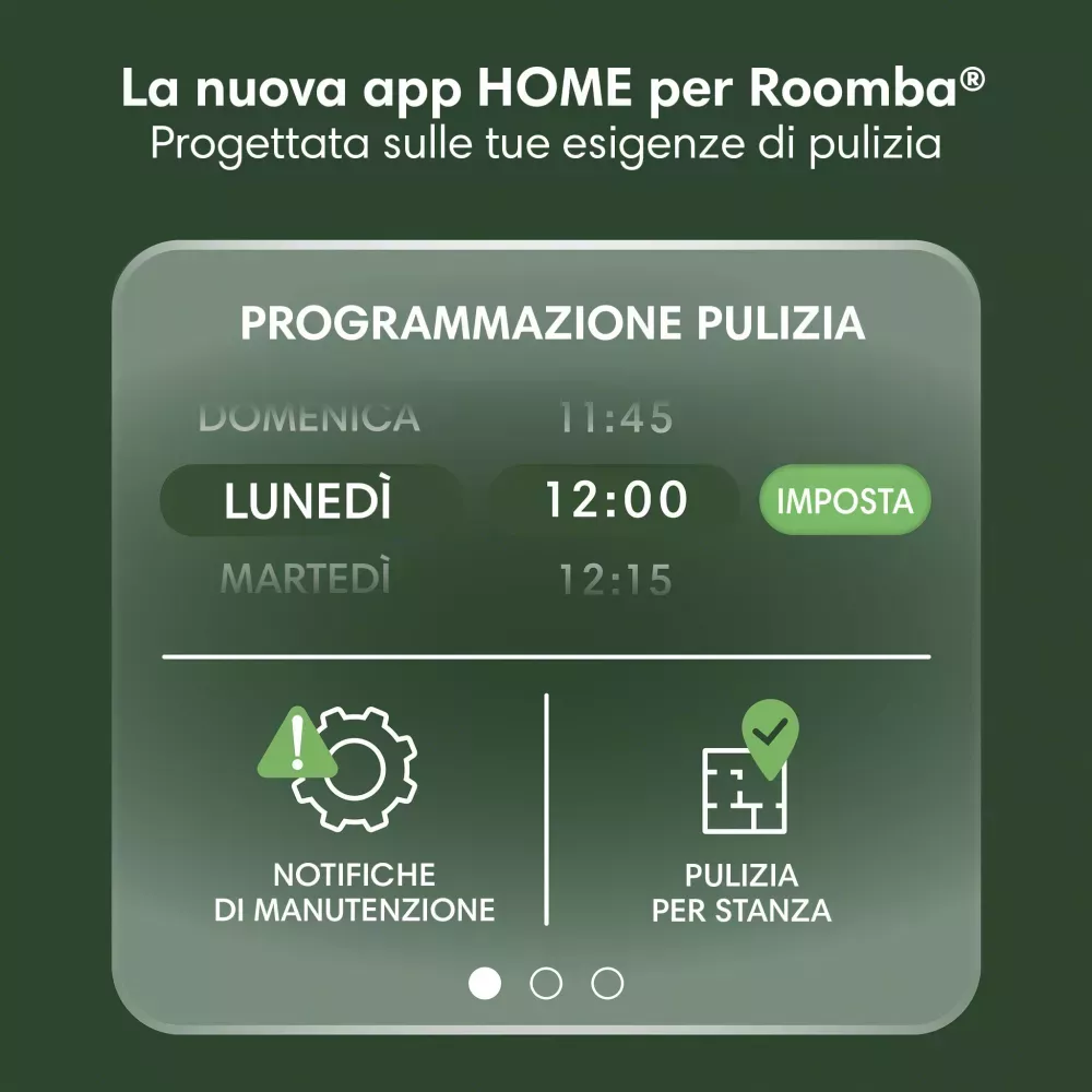 La configurazione è semplice. Basta togliere dall'imballo il robot, posizionare la base su un pavimento duro, ad almeno 1,2 metri di distanza dalle scale, assicurandosi che ci sia spazio sufficiente per il robot per muoversi dentro e fuori. Scarica l'app Roomba® Home, segui le istruzioni e in pochi minuti il tuo robot sarà pronto per partire.