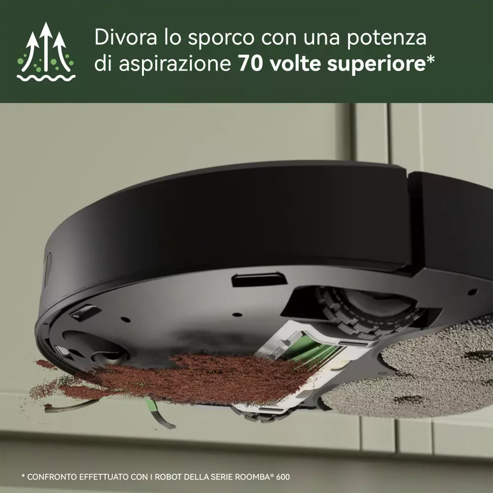Un grande aspirapolvere va oltre la sola aspirazione (anche se questo robot è dotato di una potenza di aspirazione pari a 7000 Pa). Una spazzola in gomma flessibile e una spazzola per i bordi si fanno strada attraverso i peli degli animali domestici, estraendo sporco lungo le pareti e negli angoli, mentre la funzione Carpet Boost divora lo sporco dai pavimenti duri fino ai tappeti morbidi.