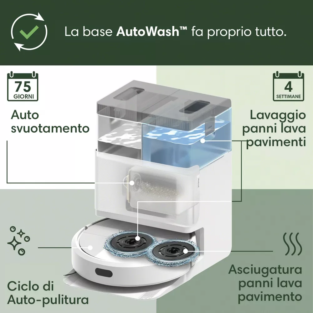La base AutoWash™ Dock si occupa di tutto in autonomia: svuota automaticamente i detriti, rinfresca i panni durante la pulizia, e li lava e asciuga a caldo al termine del ciclo, mantenendo il robot sempre pronto all’uso e igienizzato.