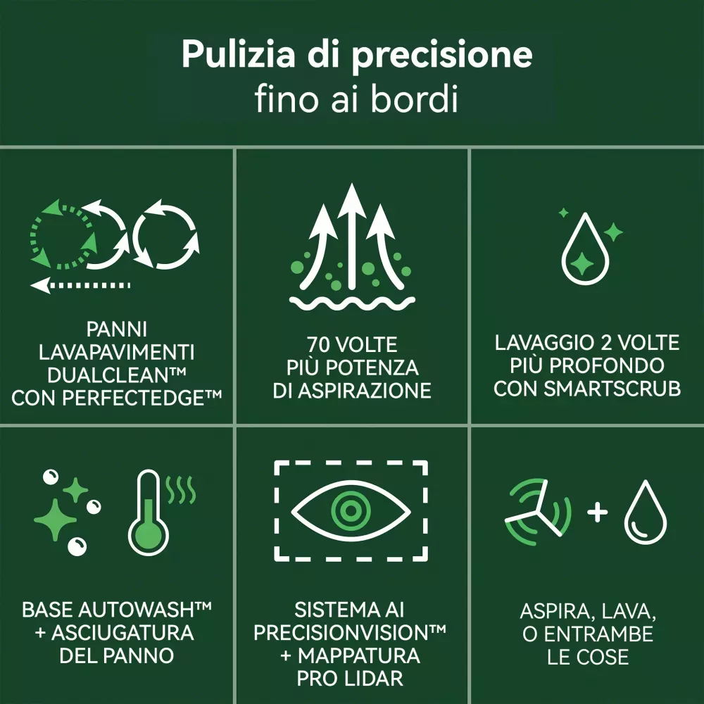 Questo bundle esclusivo include sacchetti di ricambio per la raccolta automatica della polvere e una soluzione detergente dedicata, studiata per migliorare le prestazioni di lavaggio e lasciare i pavimenti brillanti, profumati e perfettamente igienizzati.